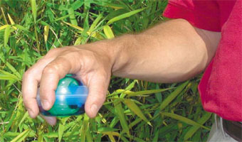 Weitaus häufiger hingegen sind Schmerzen im Hand- und Handgelenksbereich auf Grund von Überbzw. Fehlbelastungen. Amateurgolfer erzeugen durch eine ungeeignete Griffhaltung (vgl. Drive 10/02) bzw. Schwungtechnik häufig Fehlbelastungen in den Handgelenken, während der intensiv Golfende mit tiefem Handicap und der Professional eine Überbeanspruchung vorwiegend durch häufiges und intensives Spielen erleiden. Wer nach einem längeren Spielunterbruch, z.B. nach der Winterpause, körbchenweise Golfbälle auf der Range schlägt oder auf zu harten Matten abschlägt, läuft auch Gefahr, Beschwerden im Hand- und Handgelenksbereich zu erzeugen. Meistens handelt es sich um eine Sehnen- bzw. Sehnenscheidenentzündung der Beuge- oder Strecksehnen bzw. ihrer Gleitfächer. Entzündungsähnliche Reaktion Dabei liegt keine Entzündung im engeren Sinne vor, sondern nur eine «entzündungsähnliche Reaktion» auf eine wiederholte Schädigung der Sehnenund Sehnenhüllen. Eine solche typische «Golfer-Tendinitis» ist die De-Quervain-Tendinitis, bei welcher das Sehnenfach mit den Daumenstrecksehnen am speichenseitigen Handgelenk betroffen ist. Wer beim Golfen über wiederkehrende Beschwerden im Hand- und Handgelenksbereich klagt, sollte neben der Verbesserung der Schwungtechnik und der Reduktion der Griffstärke auch seine Ausrüstung anpassen. Schläger mit Graphite-Schaft und dickerem Griff aus weicheren Materialien absorbieren Kräfte zusätzlich. Bei nicht optimal getroffenen Bällen vermindern Schlägerköpfe mit peripherer Gewichtsverteilung (perimeter weighted, cavity-backed irons) im Vergleich zu geschmiedeten Schlägerköpfen (forged irons) zusätzlich die Rückschläge auf die Handgelenke. Ebenso empfehle ich Golfern mit Hand- und Hand-gelenksbeschwerden, ihre langen Eisen durch Fairwayhölzer zu ersetzen. Sind die Beschwerden akut, muss eine Golfpause eingelegt werden. Salbenverbände und entzündungshemmende Schmerzmittel können eingesetzt werden. Injektionen von entzündungshemmenden Substanzen direkt in die Sehnenscheiden stellen eine weitere wichtige Behandlungsform dar. Nicht selten ist zusätzlich eine Ruhigstellung im Handgelenk notwendig. Nur in therapieresistenten Fällen erfolgt die Entlastung des Sehnengleitfaches durch einen kleinen chirurgischen Eingriff. Im Vergleich zur Ansprechposition (Bild 1) werden beim rechts spielenden Golfer beide Handgelenke beim Rückschwung stark in Daumenrichtung und das rechte Handgelenk in leicht überstreckter Haltung abgewinkelt (Bild 2). Während des Vorwärtsschwunges bleiben beide Handgelenke relativ lange in dieser Stellung und werden kurz vor, während und nach dem Balltreffmoment in relativ kurzer Zeit in eine völlig neue Stellung übergeführt (Bild 3). Das rechte Handgelenk wird aus der überstreckte Stellung in eine neutrale und beide Handgelenke in eine in Richtung Kleinfinger gebeugte Stellung gebracht. Zusätzlich «rollt» der rechte Vorderarm über den linken. In der Finish-Position erreichen beide Handgelenke wieder eine leicht überstreckte und in Daumenrichtung abgewinkelte Stellung (Bild 4).Empfehlung Powerball Um sich vor Hand- und Handgelenksverletzungen vorbeugend zu schützen, empfehle ich, neben der Verbesserung der Schwungtechnik, die Hände und Handgelenke regelmässig durch geeignete Dehnungsübungen beweglich zu halten, gleichzeitig die Muskeln des Unterarmes durch ein golfspezifisches Training in Ausdauer und Kraft zu stärken und sich ein geeignetes Warm-up-Programm anzueignen (vgl.Drive 5/02 und 8/02). Ein neues Trend-Produkt auf dem Markt ist der Powerball. Er ist geeignet, speziell die Hände, Finger und Handgelenke sowie die Unterarmmuskeln zu stärken. Durch eine Kreiselbewegung im Handgelenk wird ein Rotor angetrieben (bis über 10000 Umdrehungen pro Minute). Die dabei entstehende Auslenk-Kraft (Drehmoment), welche bis zu 15 kg betragen kann, ist abhängig von der Rotorgeschwindigkeit und kann selber bestimmt werden. Der Stabilisierungsversuch durch die Hand, Handgelenke und Muskeln erzeugt den gewünschten kräftigenden Trainingseffekt. Golfer, die ihre Hände und Handgelenke stärken wollen, können den Powerball auf die Weihnachts-Wunschliste setzen.Doch wie mit allen anderen Trainingsgeräten gilt auch für den Powerball, dass man vor allem dann einen positiven Effekt erzielt, wenn man ihn regelmässig benützt.